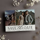 A modern save the date card designed to accommodate two engagement photos (one vertical and one horizontal) aligned in a side by side layout. "Save the date" appears beneath in chic block and script lettering, along with your names, wedding date and wedding location. Cards reverse to reveal additional save the date details.