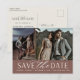 A modern save the date postcard designed to accommodate two engagement photos aligned side by side. "Save the date" appears beneath your photos in chic block and script lettering, with your names, wedding date and wedding location beneath. Postcards reverse to show additional save the date details, including your wedding website, with your return address and space for recipient addressing.