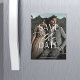 A modern save the date magnet designed to accommodate your favourite vertical or portrait orientated full-bleed engagement photo. "Save the date" is overlaid on the centre of your photo in white block and script lettering, with your names, wedding date and wedding location beneath.