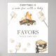 Watercolor a bonfire, marshmallows on sticks, cookie sandwich. Campfire in the woods.