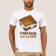 Tee shirt features an original marker illustration of a delicious chocolate-marshmallow campfire s'more, with S'MORE TO LOVE in a fun font.
