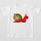 A snail may travel slo but don’t let that fool you. They are a great creature. This design of a snail is done in a cartoon style. The snail is red and the shell has a chimney coming out of it. This snail design looks great on this girls t-shirt. Perfect for yourself or as a gift