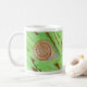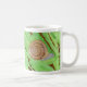 A watercolor and watercolor pencil ACEO painting of a cute little brown shelled snail in the green leaves of the wildflowers in our holler.