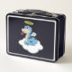 This is a standard metal lunchbox that appears to work just fine. We designed this box ourselves with an uploaded photo and custom text on the front and back. It looks absolutely beautiful except the front of the lunchbox is not centered like it shows in the photo. The print borders don't align with the inset flat part of the box where the preview photo online showed it perfectly centered in there. The back looks nice and centered though.