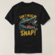 his black t-shirt features a vibrant cartoon illustration of a green crocodile with its mouth wide open, snapping at a small mosquito. The bold, yellow text "DON'T MAKE ME" curves above the crocodile, and "SNAP!" is exclamatorily displayed below, creating a humourous and attention-grabbing design.