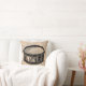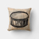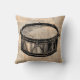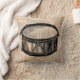 A retro style music themed throw pillow with a snare drum illustrated in black on an aged newspaper style old fashioned antique background.