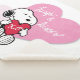 Peanuts Valentine's Day | Check out Snoopy holding onto a red heart, with pink hearts in the background that read: "hugs & kisses".