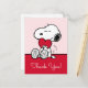 Send your thanks with the purest expression of affection! This beautiful Snoopy Thank You Card features the beloved beagle sweetly holding a bright red heart against a soft pink background. It's the perfect card for conveying deep appreciation, whether it's for a thoughtful gift, a kind gesture, or to celebrate love on any occasion. This card inside message to match your heartfelt sentiments. The classic black-and-white Snoopy illustration paired with the gentle pink backdrop creates an instantly warm and affectionate greeting that recipients will cherish.
