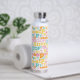 The bottle looks even better in real life. The ice cubes I put in lasts all day! I have my bottle with me all the time. It's summer and having something cold to drink feels amazing. With this bottle I always have something super cold. I have only tried the hot drink once and it lasted a long time as well. The color blue is a navy blue and the white printed on it is vibrant. It printed perfectly. I love my personalized smile water bottle.