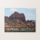 11” x 14” jigsaw puzzle with an image of a watercolor painting of a predominant and recognisable red rock formation close to the town of Sedona at the base of the Crimson Cliffs. The distinguished landmark is Snoopy Rock, a likeness to Snoopy the dog from the Peanuts cartoons.
