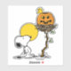 Celebrate Halloween with this charming design featuring Snoopy, the beloved beagle, gazing up at the warm glow of a full autumn moon. Woodstock sits cheerfully atop a playful jack-o'-lantern nestled in his tree-top perch. With classic Peanuts charm, this design captures the magic of the Halloween season, perfect for adding a touch of nostalgia and whimsy to any holiday occasion. Ideal for fans of Snoopy and timeless Halloween fun!