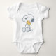 This is an adorable, short-sleeved baby bodysuit. The front features a charming, sketch-style illustration of Snoopy, sitting and looking happy while holding his paws near his face. The simple, classic Peanuts artwork is centered on the chest, giving the garment a sweet, nostalgic look perfect for a newborn or infant. This simple and high-quality design is ideal for everyday wear and a wonderful gift for any fan of the beloved beagle.