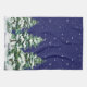 Three, snow-covered evergreen trees are superimposed on a twilight blue background as snow gently falls on the scene. Beautiful holiday image for your home.