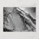Black and white photo of the zigzag trail to the summit of Mount Fiji contrasting with a covering of snow.