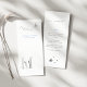 The mountains on the horizon of the Snow Covered Mountain Peaks Skis Soft Snowflakes wedding menu (2 pages) immediately evoke the pure air of the summits, the joyful descents of slopes, the snowball fights and the cold of winter. Has the evocation of all these activities whetted your appetite? It is therefore perfect since this was the hidden goal behind the elegant and naïve illustrations of Amour Paperie. Placed ajar on your dining tables, this winter wedding menu model in flat format completes your decoration. Verso, make a detailed presentation of the dishes that will be offered to your guests and do not hesitate to arouse their curiosity by playing with your pen.