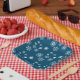 Little white snowflakes on a foggy-day blue gradient background or a deep evening blue, your choice. Stylish service with the welcome convenience of disposable paper for your holiday feast.