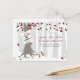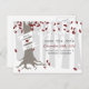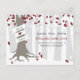A winter wedding save the date postcard featuring an illustration of a tree a snowy forest. Tree has red, white, and silver leaves, exposed roots, and a trunk wrapped with banner that can be customised with bride & groom's names.