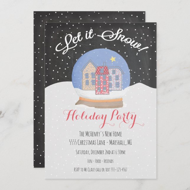 Let it snow with this Charming Snow Globe with cute houses in the falling evening snow Holiday Party , Housewarming or Christmas Party Invitation.