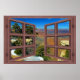 This design features a faux red wooden frame 6 pane window opening to view a bit of snow at the highest peaks at the Grand Canyon.