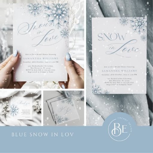 Celebrate love with our Snow in Love Bridal Shower Invitation, featuring elegant watercolor snowflakes in soft dusty blue. The modern calligraphy script and silver glitter accents add a chic, festive touch, perfect for a winter wonderland bridal shower. This invitation beautifully combines a cosy winter theme with refined design elements, making it the ideal choice for a Christmas bridal celebration. Fully customisable texts allow you to make it truly personal.
