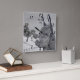 The original cute donkey portrait on this unique monochrome clock with numbers is an original pencil drawing of a little donkey I photographed a festival. This black and white realist donkey image is set against an original monochrome snow scene painting, the original landscape image is an original stylised painting of a few snow covered winter trees on a snowy hillside. This is a customisable clock, you can personalise it with your own text.