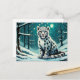 A snow leopard with snowy forest night background postcard. Easily customise the message for your needs.