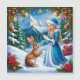 Idyllic holiday-themed scene featuring a Snow Maiden in a festive outfit interacting with a white rabbit amidst snow and evergreen decorations, set against a backdrop of snowy mountains.