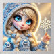 Charming snow princess adorned in intricate blue attire against a magical, snowy backdrop.