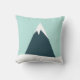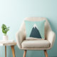 Simple, stylish snow mountain pillow with a trendy graphic illustration of a mountain in navy blue, a white snowy peak and pale blue sky background in a minimalist 'scandi' scandinavian design style.