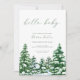 The KEIFER winter baby shower invite design features a watercolor tree line of green pine trees covered in snow in a wintery forest, paired with the phrase 'hello baby' using a handwritten script fontin a forest green, with the other winter wonderland themed baby shower details in a shade of ultra dark green to add visual interest to your merry little baby shower invitation. This winter baby shower invitation is the perfect choice for a winter baby shower.