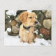 cute yellow golden retriever playing in the snow against field stone wall with ivy