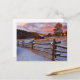 This photo features a snow covered rustic barn in front of a beautiful sunset on a Colorado ranch.