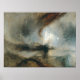 This is a reproduction of “Snow Storm - Steam-Boat off a Harbour’s Mouth”of 1842 by Joseph Mallord William Turner. He was sixty-seven years old when he created this painting. Turner was born in London and was sent to live with his uncle when his mother became mentally unstable. He began drawing at the ageof ten and his father sold them in his barber and wig shop. At fourteen he entered the Royal Academy of Art schools, and into the Academy itself the next year when he had his first exhibition. He travelled to Paris and Switzerland in 1802 and attracted several friends and patrons in his Twenties. He grew more eccentric with age and never married. He lived with his father for thirty years and, after his father’s death in 1829, he was subject to depression. He had at least two romantic liassons and died in 1851 at the house of his lover for eighteen years. This painting is an oil on canvas and measures 35.98 by 48 inches. It is in the Tate Gallery in London.
