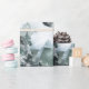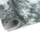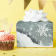 Kraft coloured wrapping paper with large and small snowflakes against a watercolor painted snowy winter woodland mountain forest with three majestic white horses cantering through the woods.