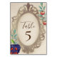 This enchanting party table number card features a Snow White fairy tale theme. An image of a poisonous apple is printed in the bottom left, with a branch of shiny red apples printed in the top right. A large golden mirror is placed in the centre with the party information. The background features a rustic style, parchment paper design to resemble a vintage fairytale book.