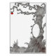 Black and white hand drawn image with red apple dangling from a gnarled branch.