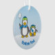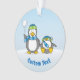 A little penguin cartoon with snowball and a fainted one. Custom text on both sides.