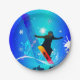 Snowboarding, snowboarder with board on blue background with snowflakes and grunge