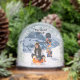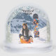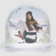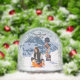Plastic snow globe with two photos back to back. Snow background design with brushstroke photo templates. Photos will have jagged edges. To further centre a photo use the design tool and double-click on your photo to move it. Also add text to one side above the photo. Sample wording is the location and year date. Wording is black with white shadow. Perfect for capturing a fun trip to the slopes.