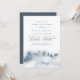 Elegant winter rehearsal dinner invitation features a watercolor background depicting a snowy mountain landscape dotted with pine tree silhouettes in misty shades of blue and grey. Personalise with your ceremony rehearsal and dinner details in chic blue-grey lettering. A beautiful choice for elegant winter rehearsal dinners in mountain, forest, or snowy settings.