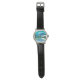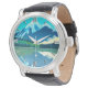 Watch in a digital painting of snow-capped mountains and pine forest, reflected in a lake, under a deep blue sky