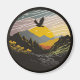 A sticker with an eagle flying over a mountain, in the style of contemporary landscape, golden light, black mountain college, fisheye lens, arts and crafts movement, mid-century illustration