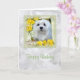 This cute Birthday Card features Snowdrop, a sweet little Maltese Dog. Her portrait is contained inside a pretty pale green frame and her portrait is surrounded by lovely yellow Freesia flowers.