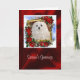 This cute Christmas Card features Snowdrop, a sweet little Maltese Dog. Her image is contained inside a gold picture frame which is embellished with red Poinsettia flowers and greenery.