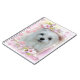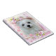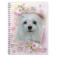 This cute Notebook features Snowdrop, a sweet little Maltese Dog. Her image is contained inside a picture frame surrounded by flowers and hearts in pink.