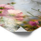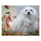 This print is a photograph of Snowdrop, a sweet little Maltese Dog sitting beside some lovely pink Cosmos flowers in a soft summer breeze.