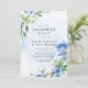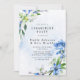 Design features a printed coloured with floral element in shades of blue and white over foliage leaves branch wreath and snowdrops and Scilla on a light blue watercolor background.. Great for your wedding celebrations!