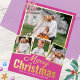 Personalised photo Christmas cards with real foil accents add a bit of glitz, glam and bling while this pink snowflake design embraces the Christmas colour trend of pink, rich dark berry pink. The simple collage design features four of your favourite family photos, each surrounded with a thin frame of real gold foil. The main photo at the top of these custom Christmas cards is accented with one single faux pink glitter snowflake in the upper left hand corner while a trio of smaller pictures across the bottom will give you lots of opportunities for sharing treasured memories from the past year. Merry in a pretty script font and Christmas in a larger simple font are both printed with real foil, shown here in gold, to add to the glam and elegance. Your name, and the year if you wish, is printed at the bottom in white. These rich raspberry dark pink Christmas cards reverse to a solid background of soft pastel pink with a text template in dark pink where you can add a personalised holiday greeting. So embrace the holiday pink, flirt with the pink snowflake and then add your 4 photos to create your own designer holiday cards.