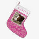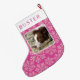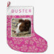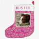 Create your own adorable dark berry pink and faux glitter snowflake personalised Christmas stocking featuring your favourite pet or kid's photo. This double sided holiday stocking is easy to customise - just add your photo and watch the template transform the image into a picture with rounded corners framed with a thin border of white. A simple modern font in a deep raspberry pink colour is ready to be personalised with the name of your choice on a white cuff border at the top of the holiday stocking, shown here typed double spaced for interest. A scatter of faux sparkle pink snowflakes fill the background of dark magenta pink to feature your photo. This Christmas stocking brings the colour trend of pink, deep rich pink, front and centre and is a cute way to design the perfect stocking for your kids or furkids i.e. dogs and cats. Adults will like them too!