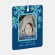 Featuring 2 of your photos, one on each side, these personalised photo Christmas ornaments are a classic keepsake gift for family and friends and this elegant faux blue opal snowflake design in deep blue will add a designer touch your holiday décor while highlighting two of your treasured photos. So easy to personalise, these custom photo ornaments have simple photo and text templates front and back that let you add your photos and optional custom text in light pastel blue on the rich blue background. If you like your ornaments without text, just clear and delete the placeholder text on each side to remove it. Upload your treasured photos, one on the front and one on the back and watch them become part of this custom design, bordered in a faux blue opal frame and accented with five chunky faux blue opal snowflakes drifting across the top of these custom aluminium holiday ornaments. The photo templates present your pictures with slightly rounded corners to match the actual ornament for an added detail. Printed on both sides, just for you, these blue opal snowflake and rich blue photo ornaments are beautiful keepsakes of Christmas with your photos of family, babies, pets and friends.